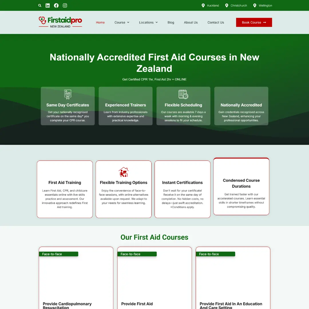 NZ First Aid is a New Zealand-based training provider offering nationally accredited first aid and CPR courses. The website allows users to browse courses, enroll online, and access same-day certification. Built from scratch using WordPress and Elementor Pro, it features custom headers and footers and a fully tailored layout to showcase course offerings, pricing, and flexible scheduling, ensuring a professional and user-friendly experience for students nationwide.