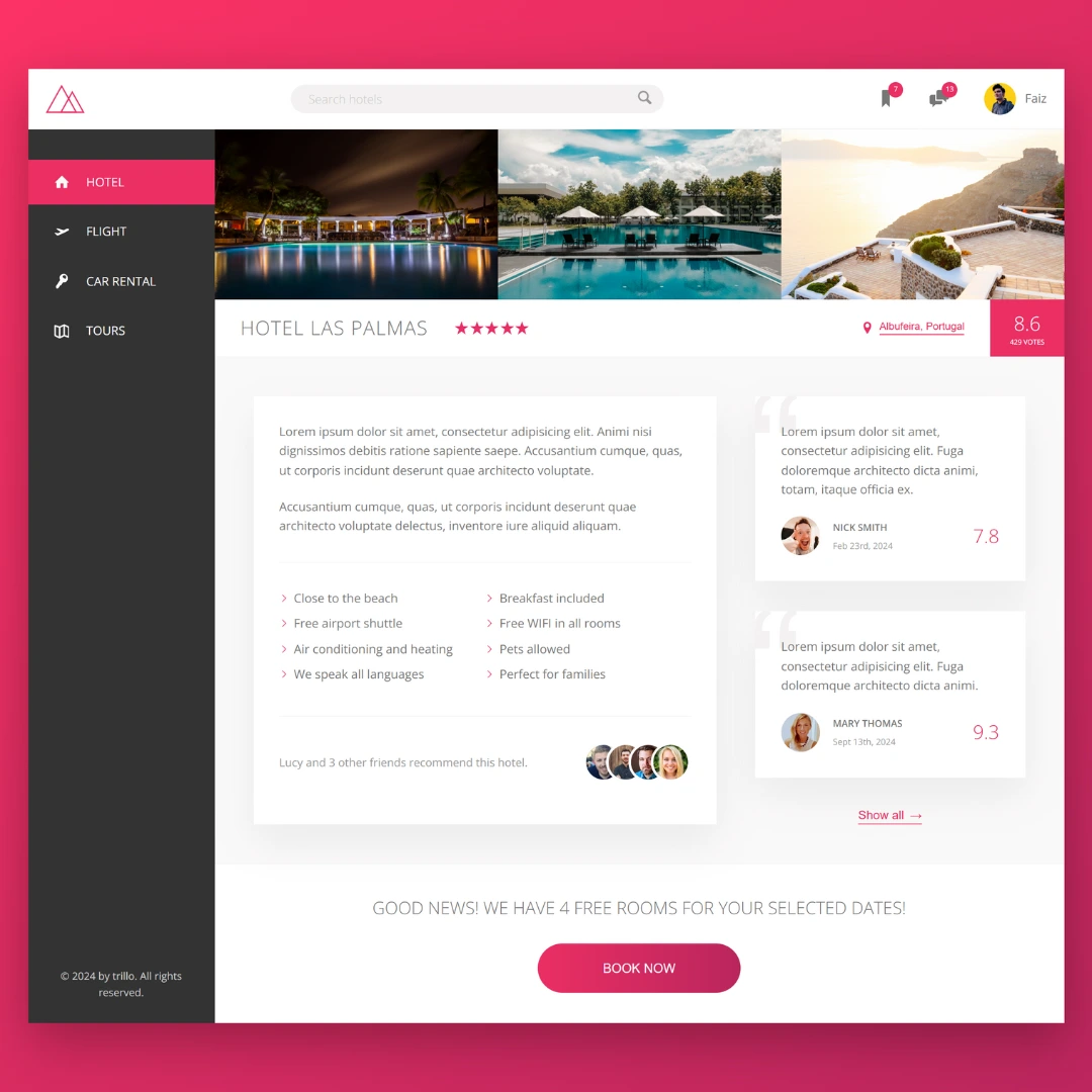 Trillo is a hotel booking app website built using advanced CSS techniques, primarily Flexbox, along with the SASS (SCSS) preprocessor for modular and maintainable styling. The website is fully responsive across all devices and demonstrates a clean, modern UI focused on usability and layout precision.