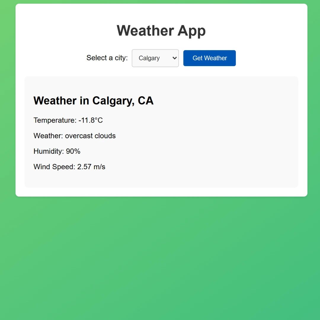 Weather App is a web application built using HTML, CSS, and JavaScript, integrating a weather API to fetch and display real-time weather data. The app provides current weather information for Edmonton, Calgary, Toronto, and New York, showcasing API integration, asynchronous JavaScript, and dynamic UI updates.